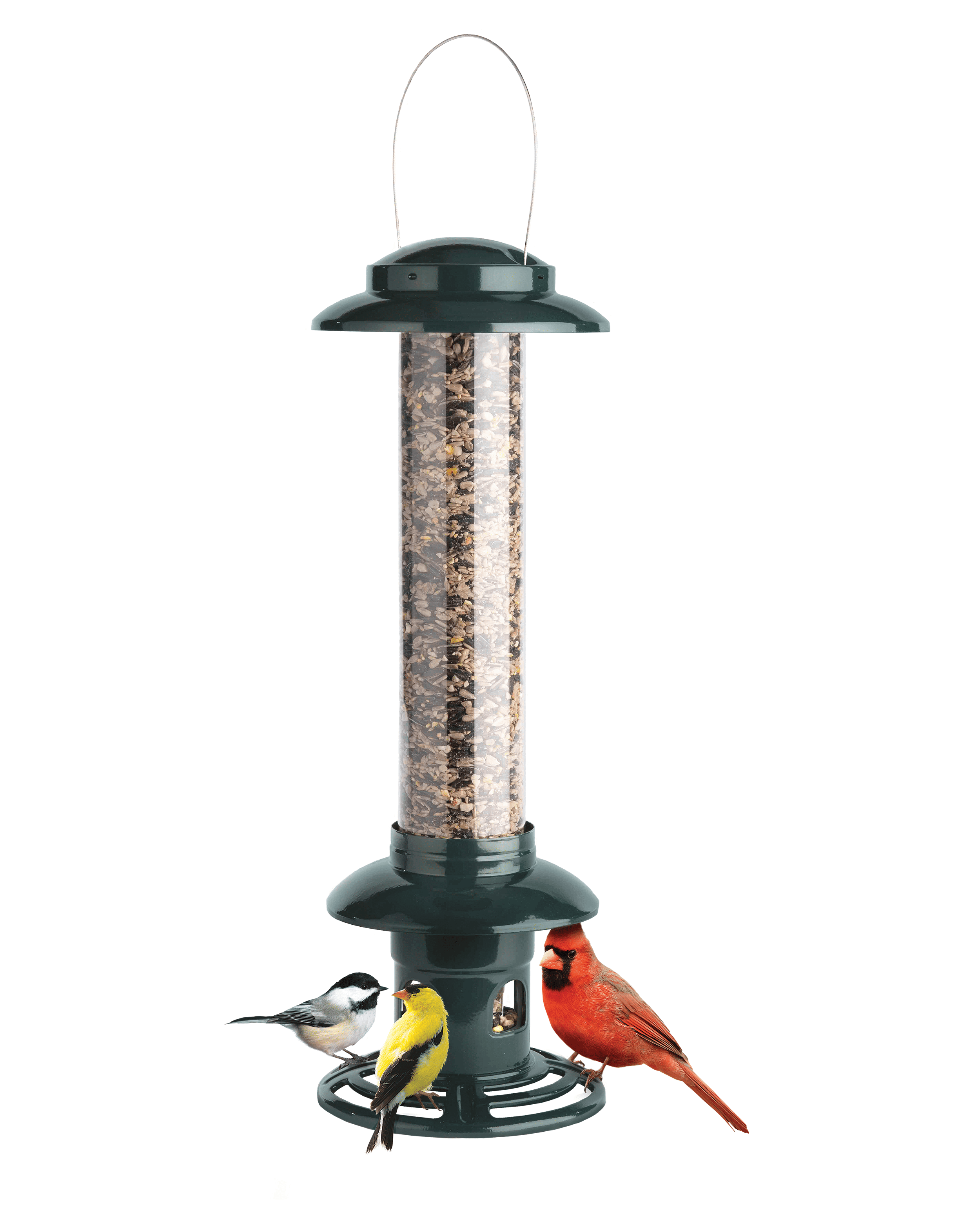 Everything you want in a feeder: Patented squirrel-proof technology, a no-tools component system that makes it so easy to clean, and with new features like a Double-Cardinal Ring which welcomes a spectrum of sizes of birds, and a patented water diversion system designed to keep seed dry. With a 1.3 quart / 1.9 lbs / 0.85 kg seed capacity, this is a perfect feeder for no mess seed blends.